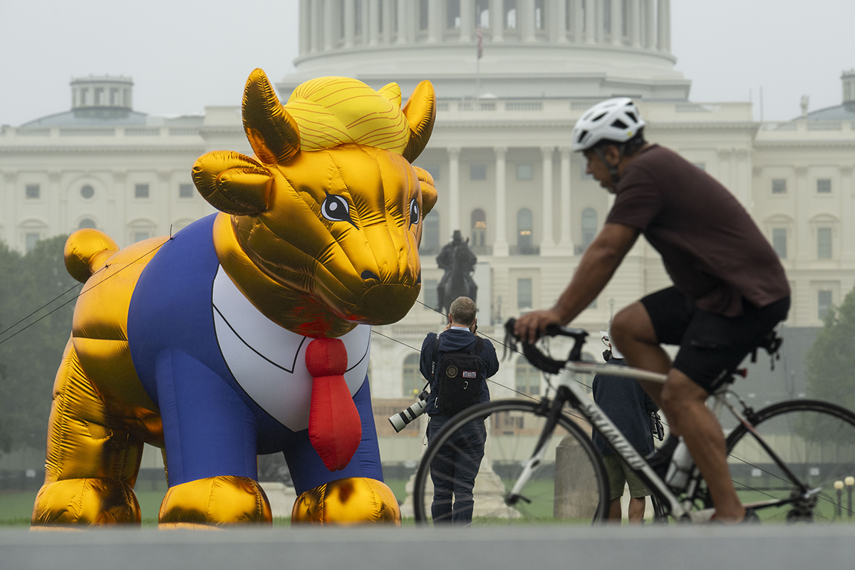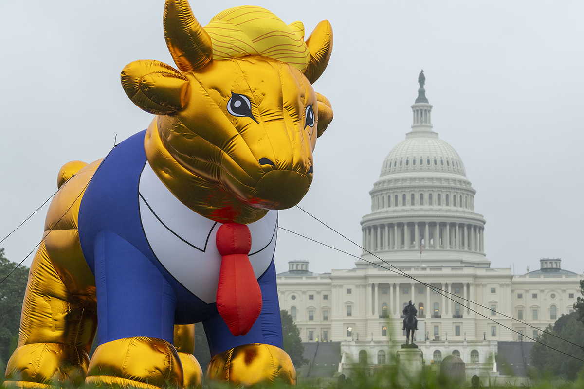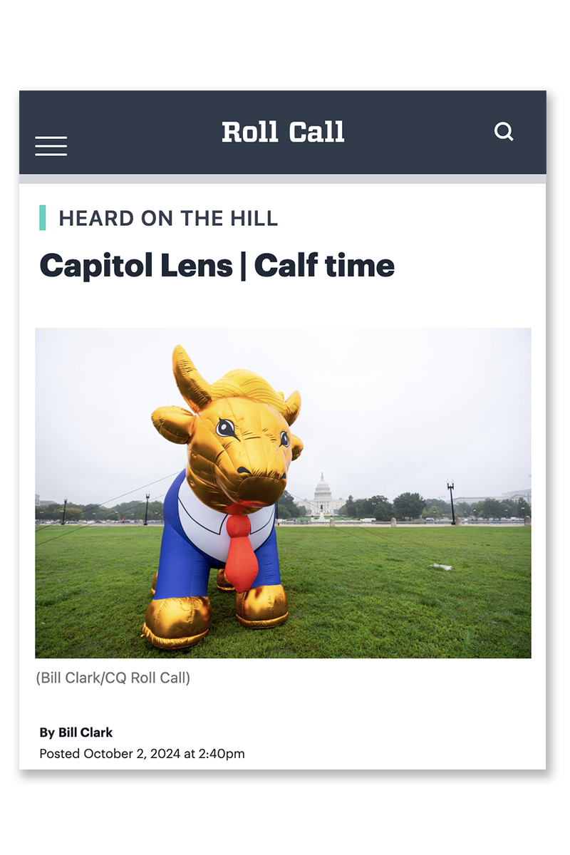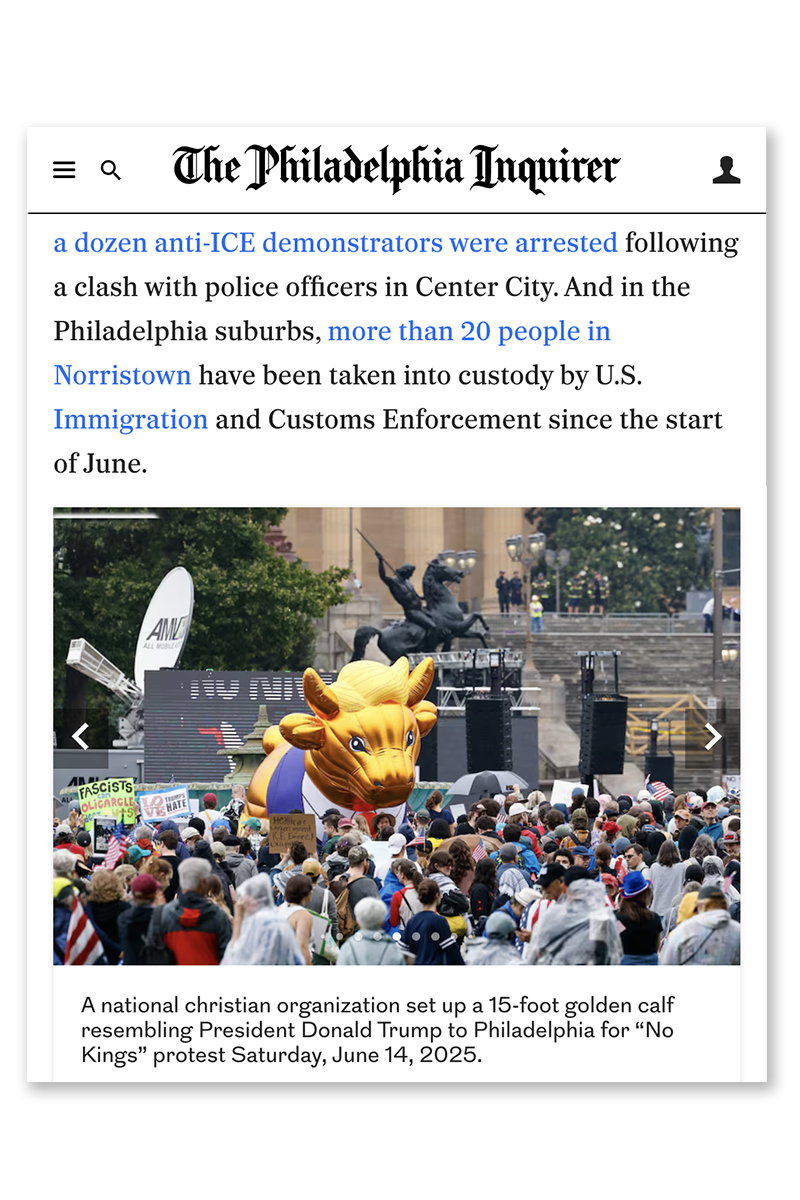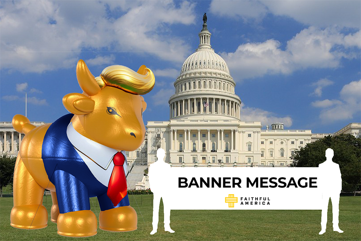 Faithful America came to the Glasgow Actions Team wanting to bring to life the image of Trump as a golden calf, a Biblical symbol of a false prophet. The network of progressive Christians would use the 15-foot inflatable to protest Christian-nationalist conferences, Trump rallies, and other events in key swing states. Using depictions of the golden calf and Trump’s most identifying features, we led the design of the balloon and worked with an inflatable vendor to bring it to life.