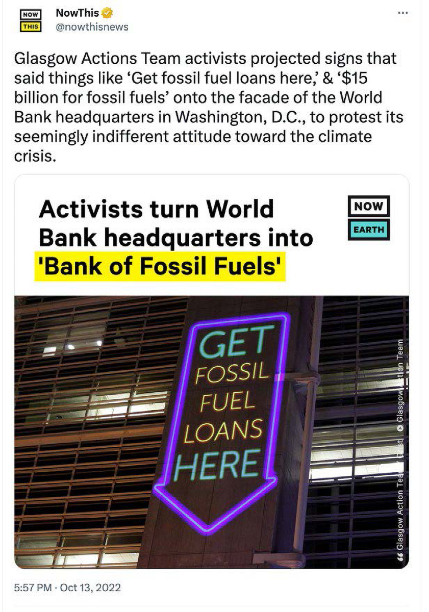 The Glasgow Actions Team (GAT) called on the World Bank to stop funding fossil fuels during their annual meeting in Washington, DC in October 2022. As world leaders discussed the Bank’s direction, GAT transformed the Bank into a fossil fuel loan dealer with a light demonstration on the Bank’s walls, showcasing the nearly $15 billion to fossil fuels the Bank has financed since the Paris Climate Agreement.