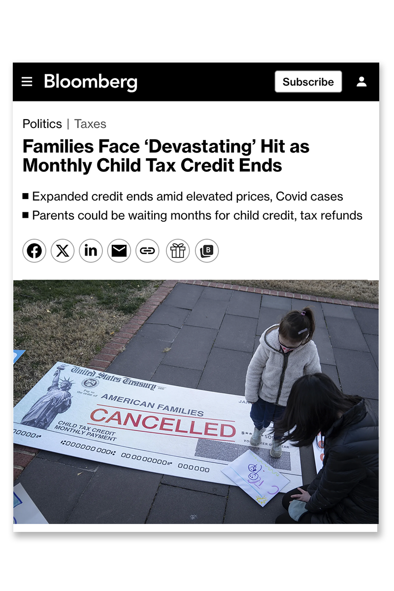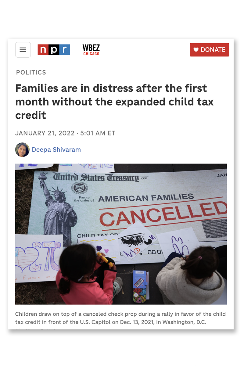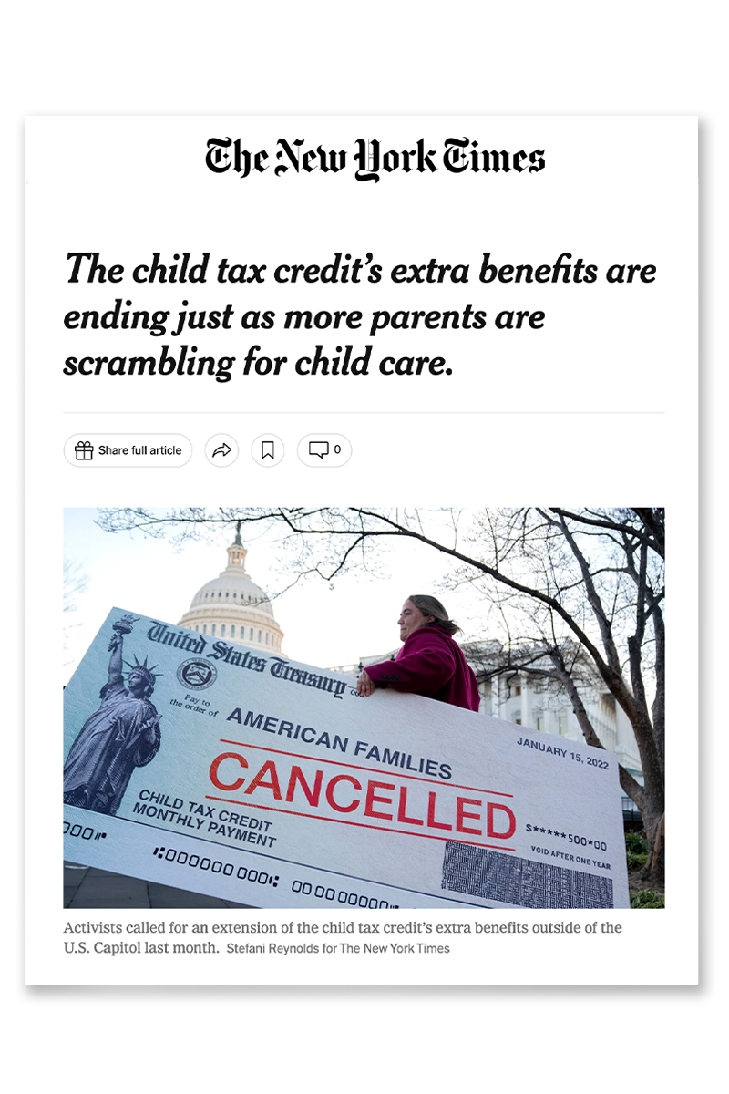 As the Child Tax Credit payments were set to expire in December 2021, Parents Together Action rallied to save them at the Capitol Building in DC. Children and parents gathered to fight for the families who would face poverty and child hunger without the payments. I was commissioned to create a giant cancelled check visual for the rally, garnering earned media in the New York Times, Time, NPR, Fortune, Bloomberg, and NBC News.